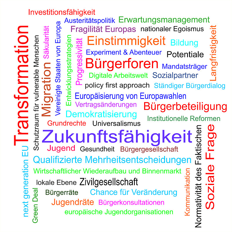 Somit gab die Auftaktkonferenz vor allem auch eine Übersicht über zahlreiche Ansätze and Anlässe für die weitere Diskussion der Zukunft Europas, welche in der beistehenden Wortwolke gesammelt und dargestellt wurden. Die Europa-Union NRW plant, diese Impulse aufzunehmen und in weiteren Veranstaltungen in Kooperation mit ihren Kreisverbänden dann die verschiedenen thematischen Schwerpunkte näher zu betrachten.