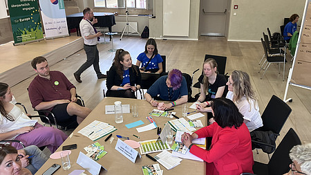 Am 1. Juni 2024 organisierten Europa-Union und JEF im Rahmen des Katholikentags in Erfurt Gesprächsrunden im World-Café Format. An drei Thementischen diskutierten insgesamt 170 Teilnehmende aus ganz Deutschland in drei Gesprächsrunden mit Abgeordneten des Europäischen Parlaments, des Bundestages und des Thüringer Landtages sowie mit Expertinnen und Experten von katholischen Fachverbänden über die Themenbereiche "Demokratie und Europawahl 2024", "Frieden, Migration und Flüchtlinge" sowie "Außen- und Sicherheitspolitik, Entwicklung und Klima".