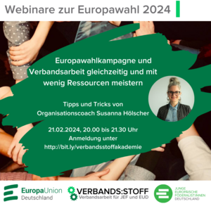 Die Europawahl rückt näher – Ehrenamtliche in ganz Deutschland stehen in den Startlöchern und bereiten Aktionen, Diskussionsveranstaltungen und weitere Aktivitäten vor. Zeit uns darüber auszutauschen! Am 24. Januar um 20 Uhr gibt es beim JEF-EUD verbands:stoff Webinar dazu Gelegenheit. EUD und JEF stellen Angebote, Materialien und Best Practices für Ehrenamtliche zur Europawahl-Kampagne EurHope vor.