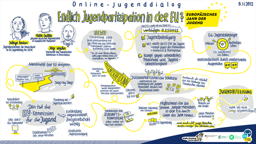 Wie das „Europäische Jahr der Jugend“ wahrgenommen wurde, was bereits umgesetzt wurde und was unbedingt noch passieren muss, diskutierten im Rahmen des Online-Jugenddialogs Sakiye Boukari, Jugendvertreterin für Deutschland im EU-Jugenddialog des DBJR, Malte Gallée, jüngster deutscher Abgeordneter im Europäischen Parlament, sowie Jörg Wojahn, Vertreter der Europäischen Kommission in Deutschland, mit den Bürgerinnen und Bürgern.