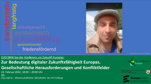 Im Projekt 'Zukunft Europas. Auf dem Weg zu ener zukunftsfähigen EU' wird im Rahmen des Projektteils "Transformationsprozesse - Varianten der Zukunft denken" am Mittwoch, 23. Februar, 18.30 - 20.00 Uhr, die folgende Vortrags- und Diskussionsveranstaltung mit Elias Sahrai, z.Z. wiss. Mitarbeiter an der PH Freiburg stattfinden.