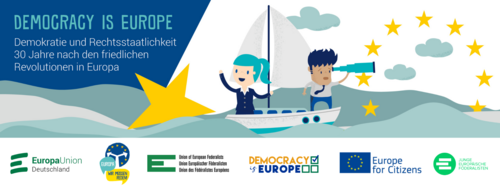 Vor 30 Jahren wurde mit den friedlichen Revolutionen in Europa eine neue Ära der Freiheit, Demokratie und Rechtsstaatlichkeit eingeleitet. Das europaweite Projekt "Democracy is Europe" lädt junge Erwachsene ein, sich über Geschichte und Gegenwart auszutauschen und die Demokratie und unsere europäischen Werte im Alltag selbst aktiv zu verteidigen. In Deutschland findet das EU-Projekt vom 1. bis 3. Dezember online statt. Drei Abende stehen zur Auswahl - historisch - praktisch - diskursiv.