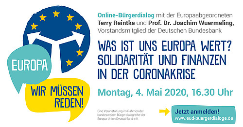 Darüber müssen wir reden! Wir laden Sie daher am 4. Mai um 16.30 Uhr herzlich zu unserem Online-Bürgerdialog mit der Europaabgeordneten Terry Reintke und Prof. Dr. Joachim Wuermeling, Vorstandsmitglied der Deutschen Bundesbank, ein.