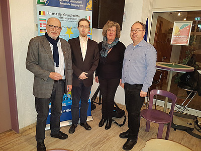 Am 13.02.2020 lud die Europa-Union Siegen-Wittgenstein zu einer Veranstaltung in die Siegener Bismarckhalle. Unter Moderation von Nikolai Edinger diskutierten auf dem Podium Prof. Dr. Hülk-Althoff (Literaturhistorikerin der Universität Siegen) und Markus Thürmann (Stellvertretender Vorsitzender der Europa-Union NRW) über die Ideengeschichte des vereinten Europas im Laufe der Zeit.
